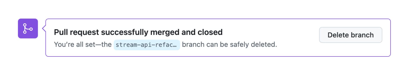 NB: If you merge the first PR but the branch is not deleted and then merge the second PR, the app can still recover from this, see Troubleshooting.