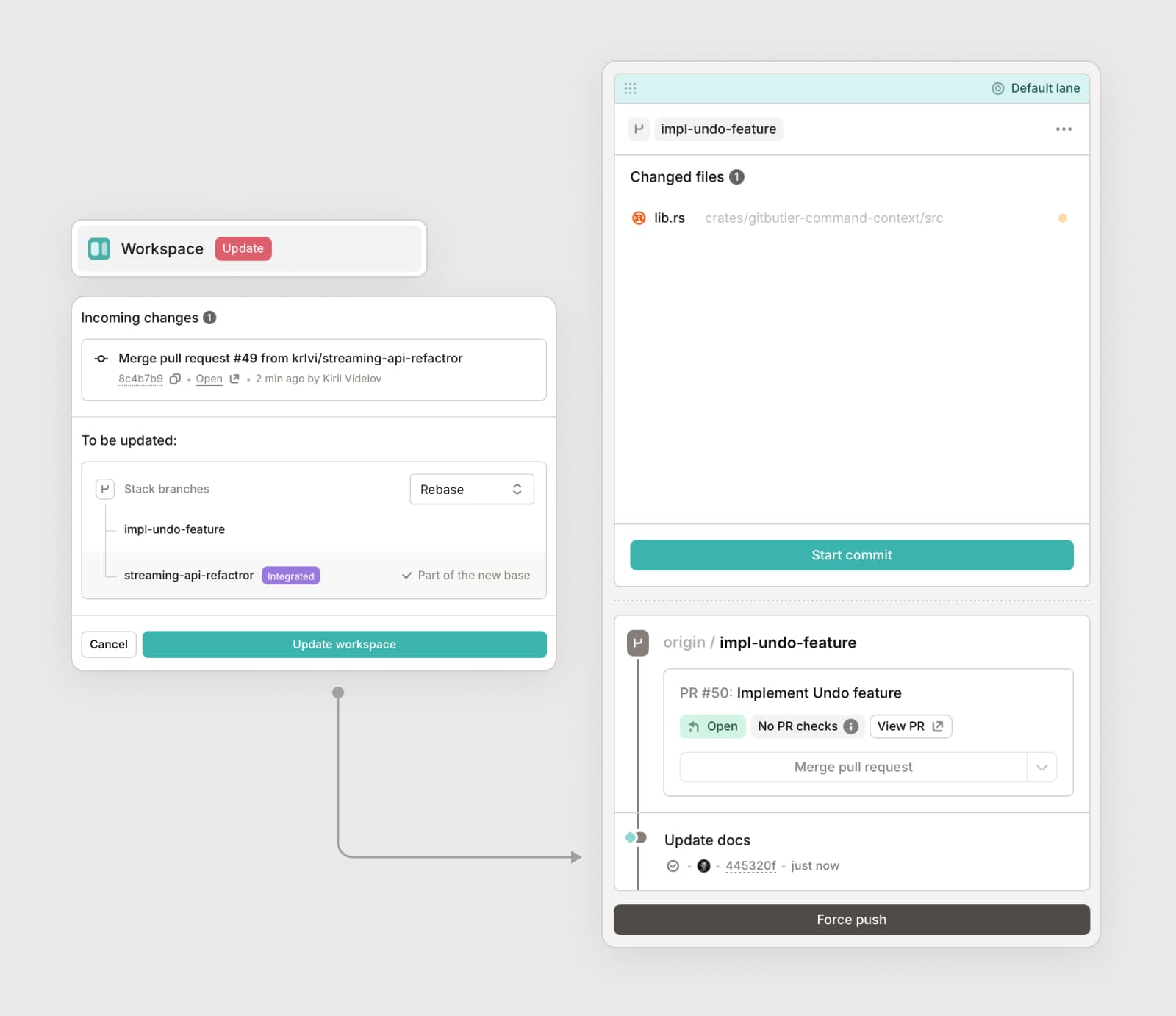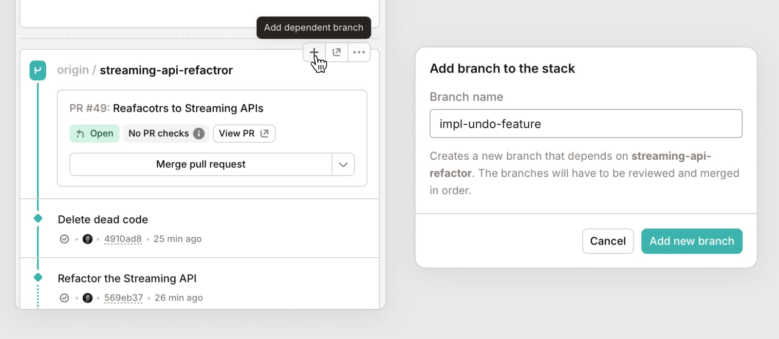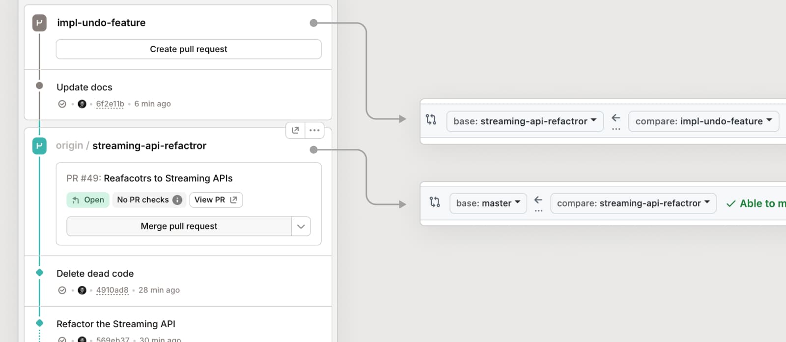 - Review/merge your PRs starting from the bottom up. After a PR/branch from your stack has been merged, it is reflected in the Stack and you should force push to reflect the changes on the remote as well.