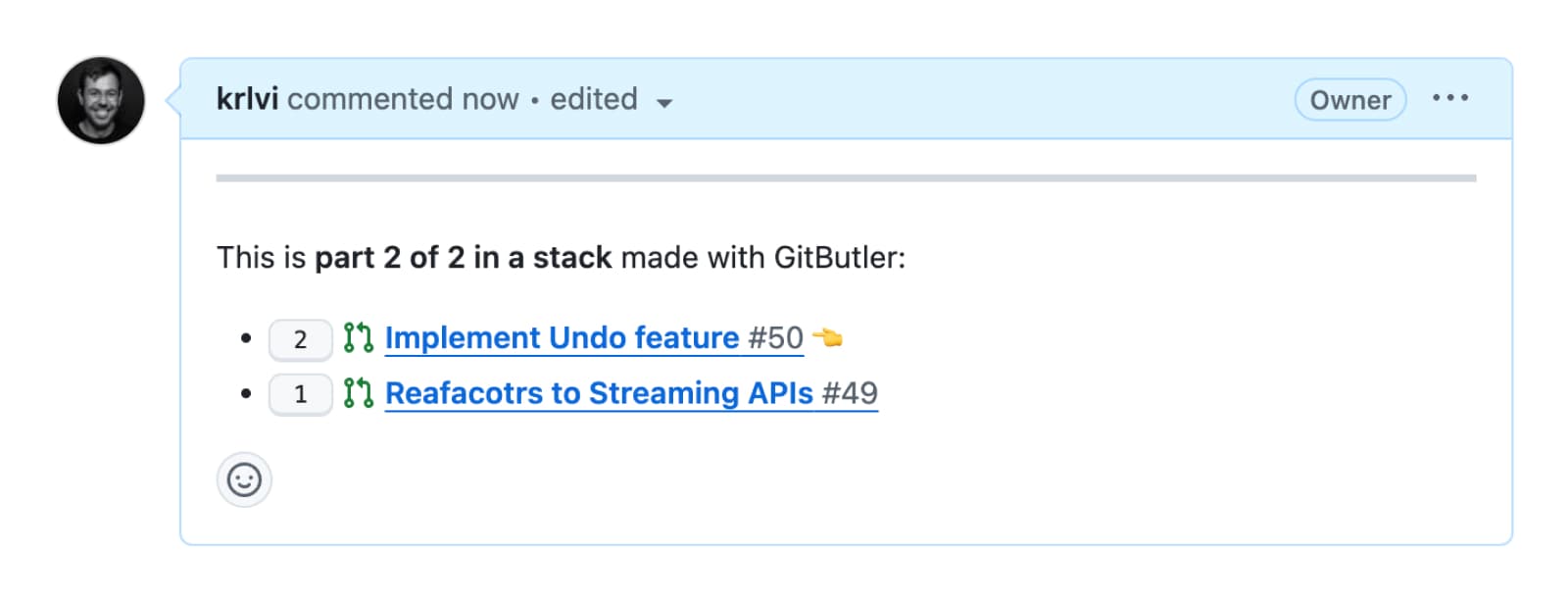 - The PRs will contain a footer with stack information, and as you add more PRs it will keep all up to date.