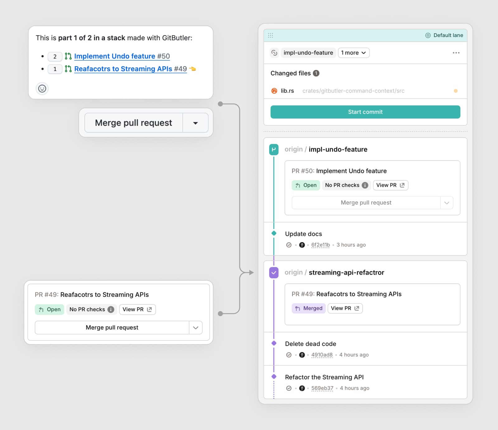 - Pushing is done for the stack as a whole. Note: The Pull Requests will be created in a way where each branch points to its parent - see Automatic branch deletion