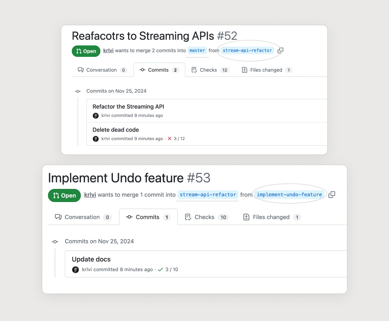 Utilizing stacked pull requests, means that the sub-tasks of a larger change are in their own PRs. This way it is possible to approve and merge the initial part of a stack (e.g. a refactor) while still iterating on the remaining sub-tasks.